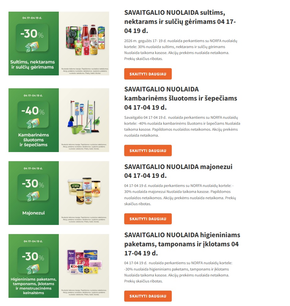 Nesvarbu, ar ieškote maisto prekių, vaistinių, statybos ar buities prekių nuolaidų, kosmetikos ar parfumerijos pasiūlymų – visa tai rasite čia, patogiai vienoje vietoje. Kasdien atnaujinami akcijų leidiniai leis lengvai sekti naujausius pasiūlymus ir padės sutaupyti.