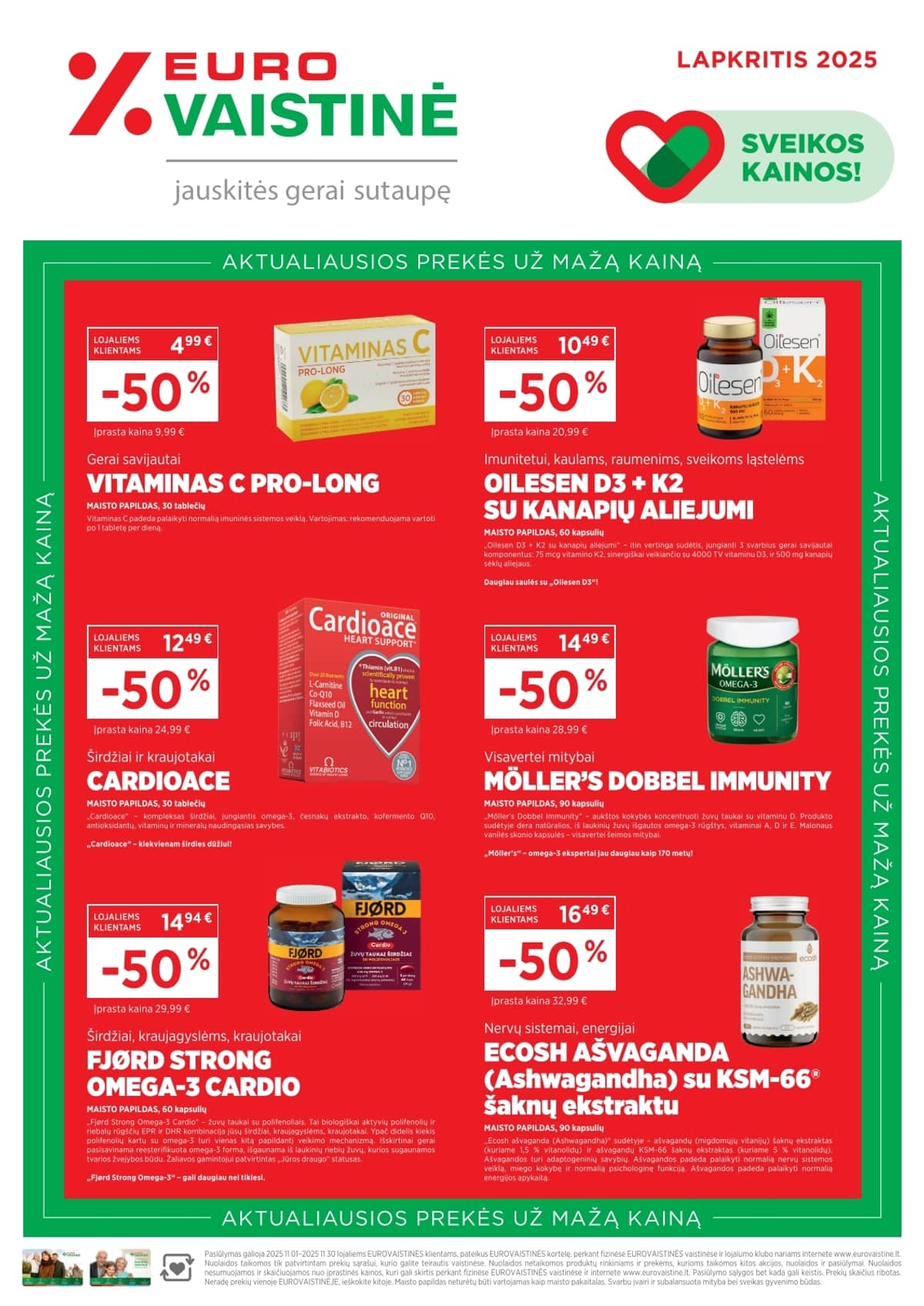 Euro vaistinė nuolat siūlo platų įvairių akcijų ir nuolaidų pasirinkimą, padedantį pasirūpinti sveikata už patrauklią kainą. Kiekvieną mėnesį leidžiamas specialus nuolaidų leidinys, kuriame rasite pasiūlymų vaistams, maisto papildams, vitaminams, kosmetikai, higienos prekėms ir kitoms sveikatos priežiūros priemonėms. Akcijos dažnai siekia 20–50 %, o kai kuriems produktams taikomos dar didesnės nuolaidos.